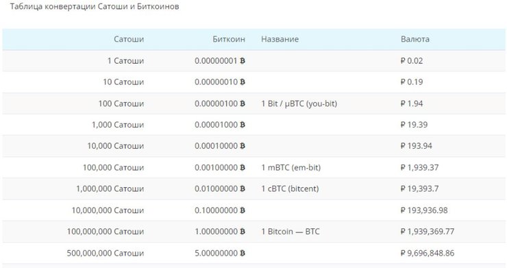 Таблица конвертации сатоши и биткоинов расположена еще ниже. В ней подробно расписано отношение сатоши и биткоина и стоимость этой части в рублях.
