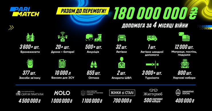 За четыре месяца войны размер помощи Parimatch составил 180 млн – главным образом на адресное обеспечение подразделений ВСУ, непосредственно участвующих в боевых действиях против агрессора. Все это время Parimatch закупает средства индивидуальной защиты и военное оборудование: бронежилеты, шлемы, тактические очки, тепловизоры, автомобили и даже топливо по просьбе командиров воинских частей Киевской, Харьковской, Запорожской, Николаевской, Полтавской областей.