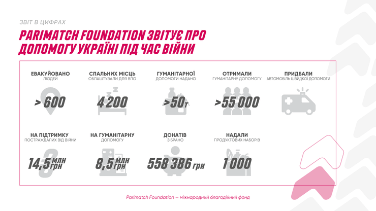 Загалом за чотири місяці повномасштабної війни в Україні, Parimatch Foundation закупив і розподілив понад 50 тонн гуманітарної допомоги, витративши 8,5 млн грн. Кількість благоотримувачів склала більш як 55 тисяч українців.