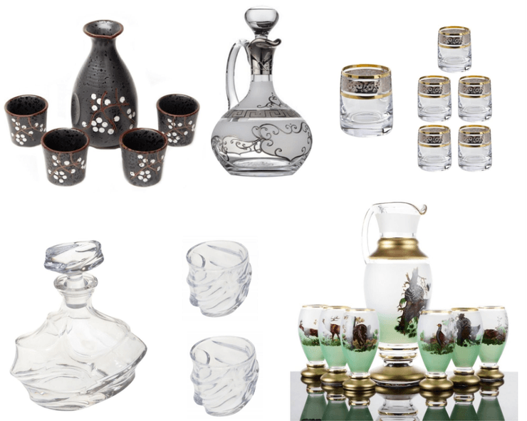 Респектабельный вид имеют рюмки для водки. Объем рюмки – 60 мл, она достаточно компактна, изготовлена из качественного богемского стекла, имеет толстое массивное дно. Основное украшение изделия – золотая или серебряная кайма и изящный узор. Можно купить комплект – рюмки с графином, отдельно рюмки и отдельно графин. Объем графина – 740 мл. Эффектно смотрятся наборы для виски. Толстостенные бокалы с широким дном и штофы с оригинальными крышками делают даже недорогой алкоголь благородным напитком.