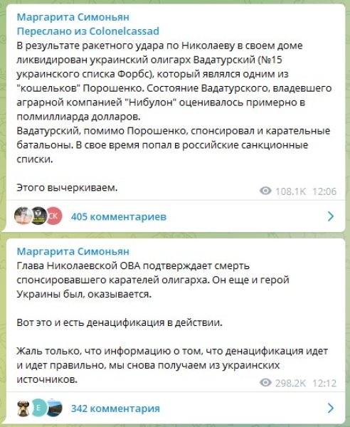 Российские пропагандисты отреагировали на смерть генерального директора компании "Нибулон" Алексея Вадатурского. Главный редактор Russia Today Маргарита Симоньян и "военный эксперт" Борис Рожин написали на своих страницах в Telegram, что Вадатурский, который был героем Украины, был ликвидирован в рамках "денацификации".