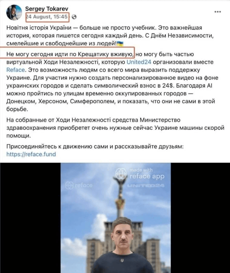 "Наверно, нельзя упрекать гражданина России Токарева в том, что он свободно покидает территорию Украины во время войны. Но это цинизм высшей степени — патриотично поздравлять украинцев своей виртуальной картинкой с Майдана, а в это же время красиво отдыхать на зашкварном курорте. И сетовать, что не смог (побывать на Крещатике — ред.), когда на самом деле не захотел", — написал Кочетков.