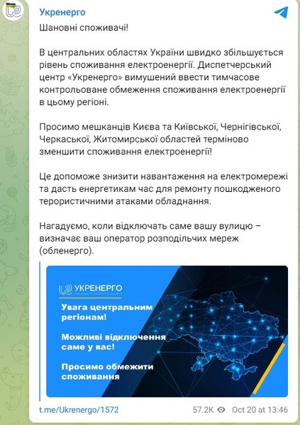 Глава Полтавской ОГА Дмитрий Лунин сообщил, что в области уже временно отключают электричество как для предприятий, так и для бытовых пользователей.