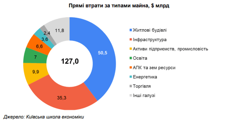 Наибольший ущерб нанесен жилищной инфраструктуре — 39,7% или на $50,5 миллиардов. Сумма выросла на $11,2 млрд по сравнению с началом июня. Оккупанты повредили и разрушили 135,8 тыс. частных и многоквартирных домов.