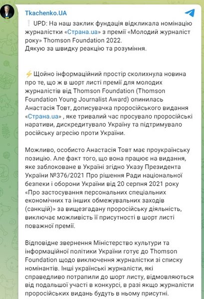 Отметим, что несмотря на блокировку ресурсов и введенные ограничения, "Страна.ua" продолжает активно работать в Украине. Более того журналисты издания успели поучаствовать в медийном скандале в связи с тем, что они пытались номинироваться на престижную премию "Молодой журналист года" Thomson Foundation 2022, которую могут получить журналисты в возрасте до 30 лет за авторские материалы на важные социальные темы.