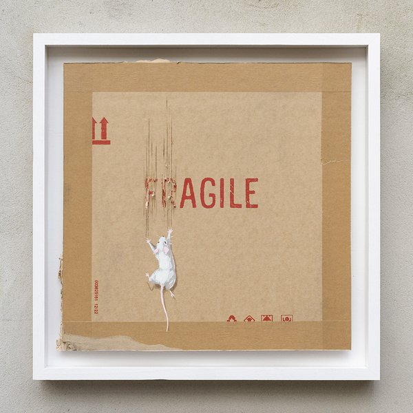 Сообщается, что каждое изображение с крысой и надписью Fragile (хрупкий, — ред.) будет иметь уникальный вид, потому что художник использовал заостренный резак для пиццы, чтобы создать имитацию царапин.