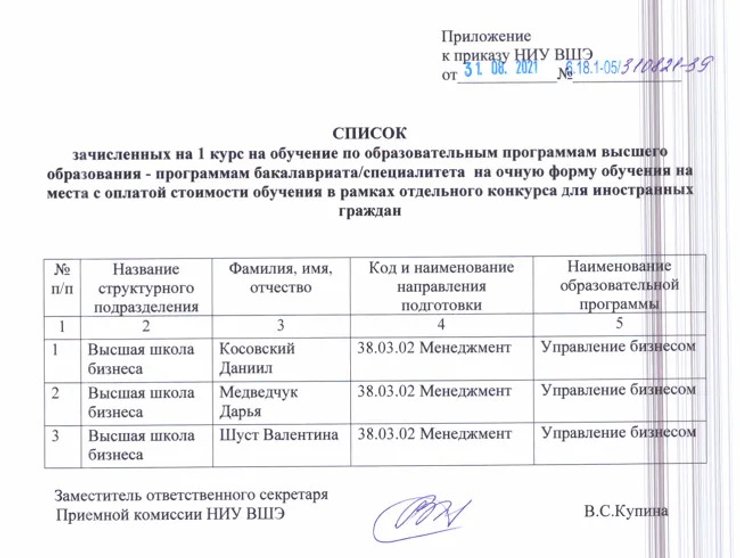 Сейчас дочь Медведчука учится в Москве, а именно — в Высшей школы экономики (ВШЭ). Из приказа от 31 августа 2021 года известно о зачислении Дарьи Медведчук и еще двух студентов на факультет "Высшая школа бизнеса". Все трое являются гражданами Украины и поступали на одну из самых востребованных специальностей факультета по спецпроцедуре для иностранцев — сдавали внутренние вступительные экзамены.