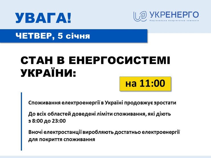Чтобы обеспечить равномерную нагрузку на энергосети, все украинские области получили лимиты потребления электроэнергии, которые действуют с 8 утра до 23 часов вечера. Если лимиты будут превышаться, в стране снова введут аварийные отключения света.