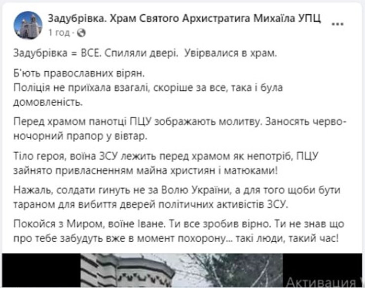 "Задубровка = все. Спилили двери. Ворвались в храм. Бьют православных верующих. Полиция не приехала вообще, скорее всего, такая и была договоренность. Перед храмом батюшки ВТО изображают молитву. Заносят красно-черный флаг в алтарь. Тело героя, воина ВСУ лежит перед храмом как хлам, ПЦУ занята присвоением имущества христиан", — говорится в сообщении.