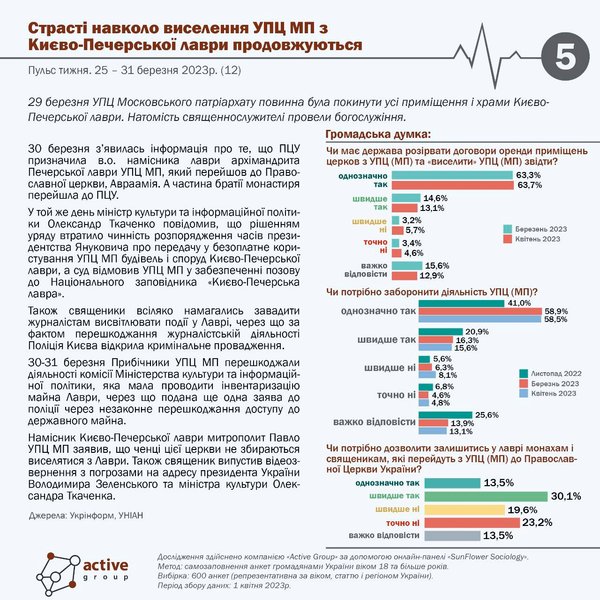 Соцопрос компании Active Group, проведенный с 25 по 31 марта этого года показал, что почти 80% украинцев одобряют запрет деятельности УПЦ МП в Украине.