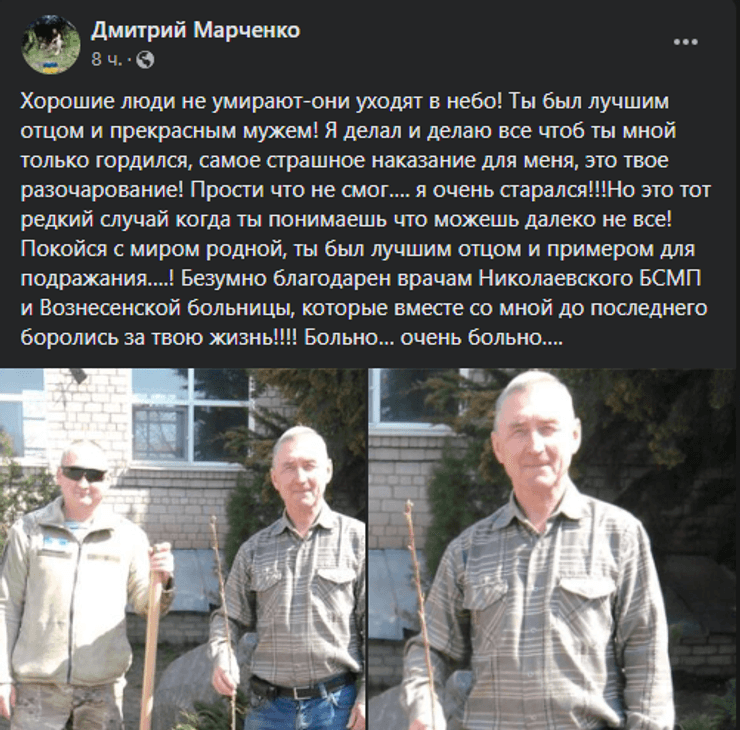Из сообщения понятно, что отец находился в городе Вознесенск Николаевской области и за его жизнь боролись врачи Николаевского БСМП и Вознесенской больницы. 45-летний украинский генерал-майор признался, что он все делал и делает, чтобы отец гордился им, а самое страшное наказание для него — разочарование отца.