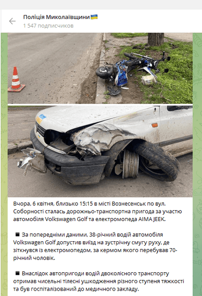 В сводке полиции Николаевской области 6 апреля появилась информация, что 38-летний водитель автомобиля Volkswagen Golf допустил выезд на встречную полосу движения, и столкнулся с электромопедом, за рулем которого находился 70-летний мужчина. Все это время, судя по всему, за жизнь мужчины боролись врачи.