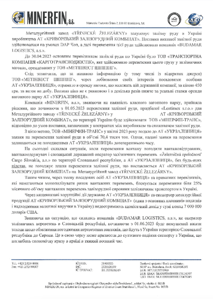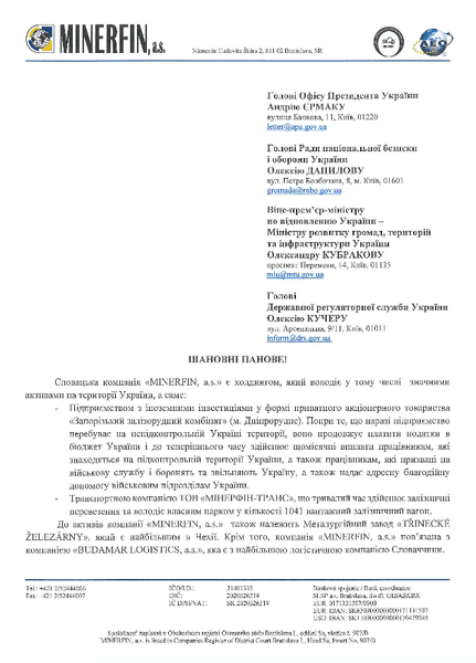 В своем письме словацкая компания указывает, что владеет в Украине "Запорожским железорудным комбинатом" в Днепрорудном, а также транспортной компанией с собственным парком в 1041 году железнодорожный вагон. К активам "MINERFIN, as" также относится металлургический завод Třinecké Železárne, крупнейший в Чехии.