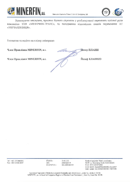 Сегодня, заявляют в "MINERFIN, as", сложилась ситуация, когда грузоотправитель и грузополучатель согласовали перевозку груза, словацкий перевозчик CARGO ("Budamar logistics, as") согласовал транзитную перевозку на территории Словацкой республики, а Укрзализныця, без каких-либо оснований не согласовывает планы перевозки железной руды, поставляемой с украинского предприятия металлургический комбинат в Чехии.