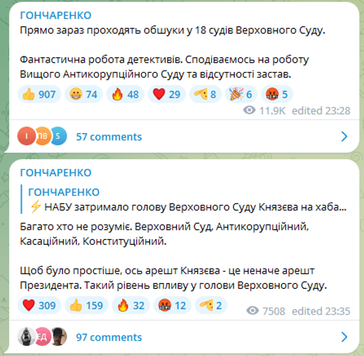 "Фантастическая работа детективов, надеемся на работу Высшего Антикоррупционного Суда и отсутствие залогов. Многие не понимают. Верховный Суд, Антикоррупционный, Кассационный, Конституционный. Чтобы было проще, арест Князева — это как арест президента. Таков уровень влияния у главы Верховного Суда", — объяснил политик.