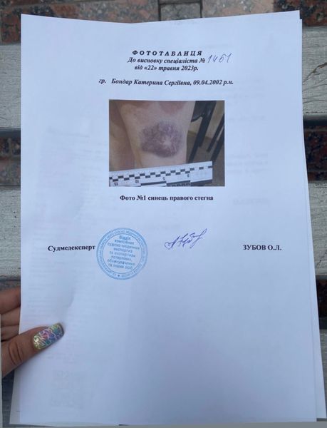 По словам Бондарь, медики зафиксировали у нее "повреждение капсульно-связочного аппарата сустава левой лучезапястной кости", многочисленные ушибы и сотрясение мозга. В опубликованном заключении судмедэксперта говорится о легких телесных повреждениях: ушибе мягких тканей и синяке.