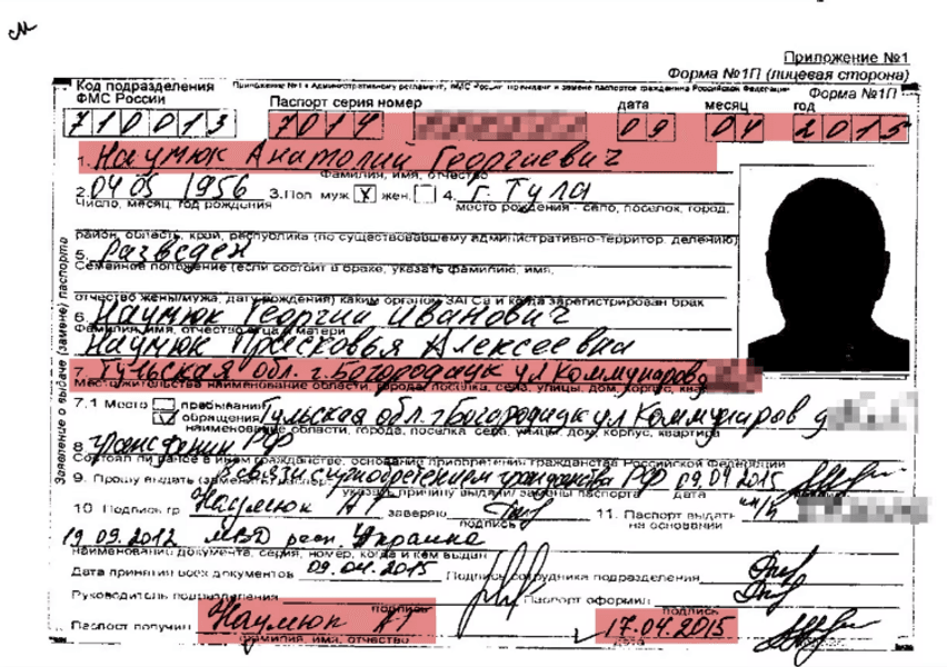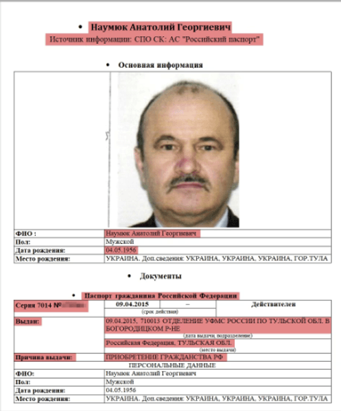 Отца нового заместителя главы Службы безопасности Украины Сергея Наумюка, уличили в наличии действующего российского паспорта. Это подтверждено выпиской из системы "Роспаспорт", сообщают 26 мая журналисты проекта "Схемы"