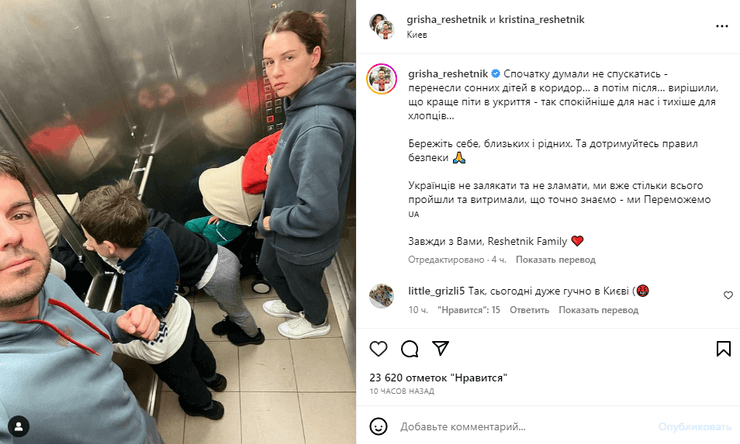 "Сначала думали не спускаться — перенесли спящих детей в коридор, а потом решили, что лучше пойти в убежище — так спокойнее для нас и тише для мальчиков… Берегите себя, близких и родных. И соблюдайте правила безопасности. Украинцев не запугать и не сломить, мы уже столько всего прошли и выдержали, что точно знаем — мы победим", — написал Решетник.