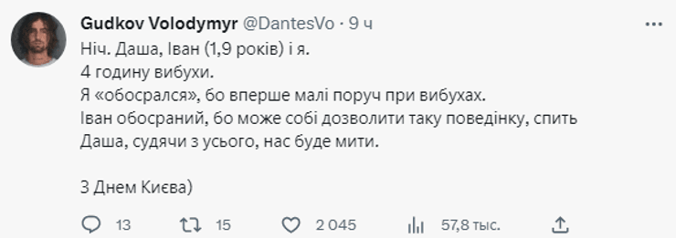 "Ночь. Даша, Иван (1,9 года) и я. Четвертый час взрывов. Я "об##рался", потому что впервые малыш рядом во время взрывов. Иван "об##ран", потому что может себе позволить такое поведение, спит. Даша, судя по всему, нас будет мыть. С Днем Киева", — поделился Дантес.