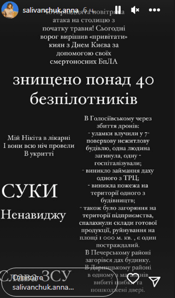 "Четырнадцатая воздушная атака на столицу с начала мая. Сегодня враг решил "поздравить" киевлян с Днем Киева с помощью своих смертоносных беспилотников. Мой Никита в больнице. Они всю ночь провели в убежище. Уб##ки, ненавижу. Слава ВСУ!" — эмоционально написала Анна.