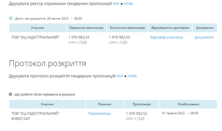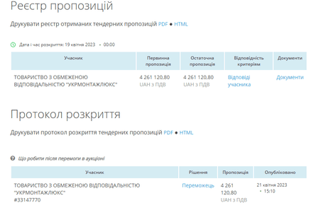 Стоит отметить также тот факт, что в торгах большинство тендеров, проведенных различенными профильными управлениями КГГА принимает участие лишь одна фирма. В частости, за май 2023 года состоялось 6 тендеров на ремонт укрытий и ни в одной из закупок не принимало участие хотя бы 2 фирмы.