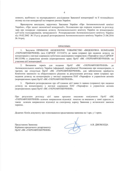 При этом участники концентрации в Антимонопольный комитет Украины подают совместное заявление относительно собственно концентрации. То есть, кроме заявления ПАО "Укрнафта" и АРМА, в их заявлении должна была быть представлена позиция "Укрнефтебурения", которая соглашается на подобную концентрацию в виде хотя бы подписи под заявлением. Однако никакой подписи заявления со стороны компании не было.
