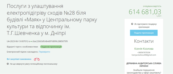 Коммунальное предприятие "Городская инфраструктура" Днепровского городского совета объявила тендер на подогрев ступенек в парке Шевченко. Предложение размещено 16 июня на онлайн-платформе Prozorro.