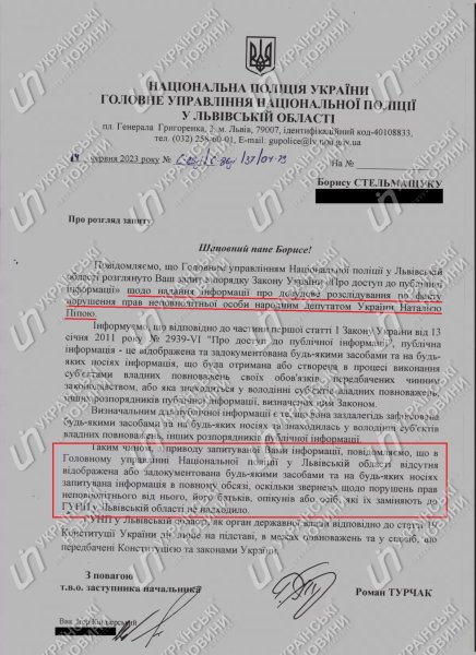 В Главном управлении Нацполиции во Львовской области не проводят досудебное расследование по факту нарушения прав несовершеннолетнего народным депутатом Украины Наталией Пипой, которая без разрешения обнародовала в сети видео языкового конфликта с подростком. Об этом говорится в ответе ГУ Нацполиции во Львовской области на информационный запрос издания "Українські новини".
