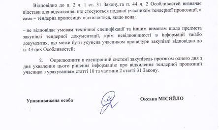 Согласно опубликованной документации, уполномоченная местного органа совета по вопросам госсзакупок Оксана Мисяйло отказала подрядчикам в связи с тем, что предложенные ими тренажеры "не соответствуют условиям технической спецификации". Иными словами — предложенные тренажеры поссовету не подошли.
