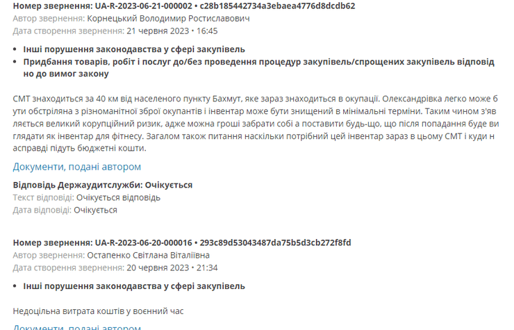 "Александровка легко может быть обстреляна из разнообразного оружия оккупантов и инвентарь может быть уничтожен в минимальные сроки. Таким образом появляется большой коррупционный риск, ведь можно деньги забрать себе, а поставить что-либо, что после попадания будет выглядеть как инвентарь для фитнеса. В общем также вопрос насколько нужен этот инвентарь сейчас в этом ПГТ и куда на самом деле пойдут бюджетные средства", — говорится в тексте жалобы.