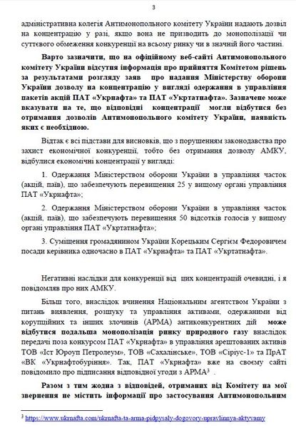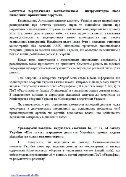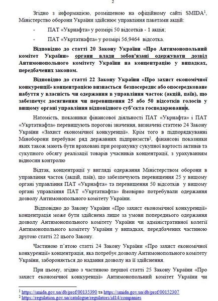 В своем обращении политик акцентирует внимание на том, что Минобороны руководит 50%+1 акция "Укрнафта" и 56,9464% "Укртатнафты", что требует от АМКУ предоставления разрешения на концентрацию. Так, согласно статье 22 Закона Украины "О защите экономической конкуренции", концентрацией считается получение контроля за более чем 25% и 50% акций предприятия.