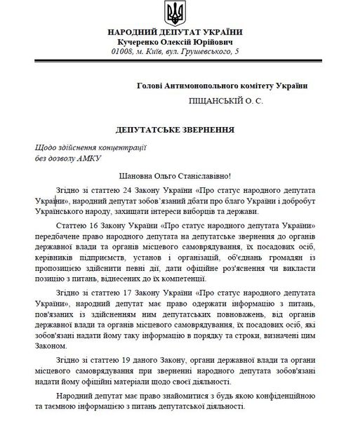 "Согласно статье 20 Закона Украины "Об Антимонопольном комитете Украины" органы власти обязаны получать разрешение Антимонопольного комитета Украины на концентрацию в случаях, предусмотренных законом. А значит, должно было предоставляться разрешение", — отмечает в своем обращении Алексей Кучеренко.