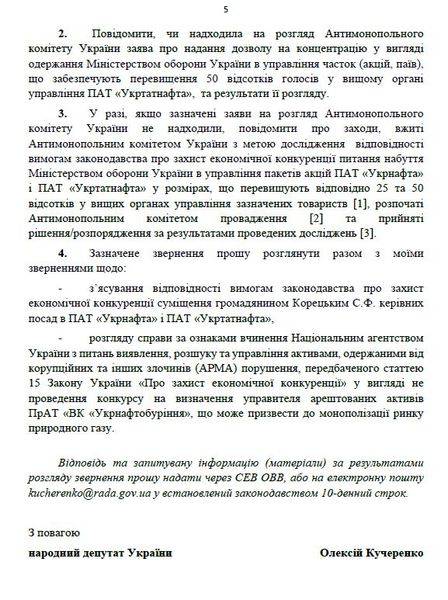 В связи с этим Алексей Кучеренко просит предоставить информацию, поступали ли в АМКУ разрешение на концентрацию Министерством обороны активов "Укрнафты" и "Укртатнафты" и если не поступали, сообщить, какие меры были приняты на это нарушение законодательства. В частности, политик требует расследования Антимонопольным комитетом.