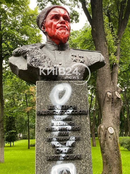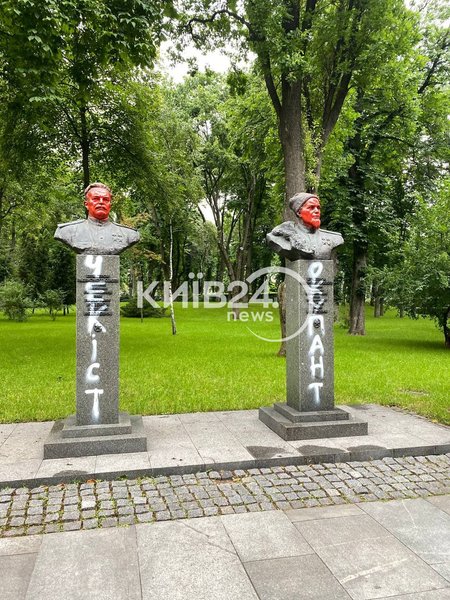 "Краской облили, в частности, бюст Сидора Ковпака (на постаменте надпись "оккупант") и Алексея Федорова (надпись на постаменте — "чекист")", — проинформировали в СМИ.