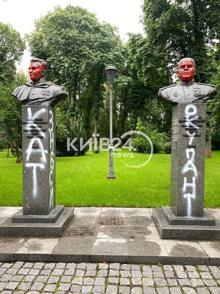 Надпись "палач" "украшает" бюст генерала Ивана Черняховского. Также на постаментах написали "снеси". Очевидно, это был радикальный призыв убрать памятники советским героям из парка.