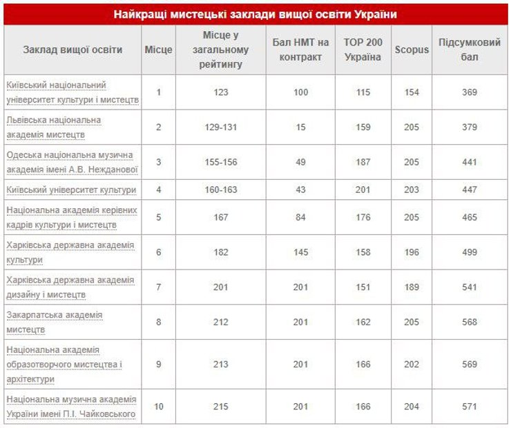 Информационный ресурс "Освіта.ua" представил вузы сферы культуры и искусств, занявшие самые высокие места в консолидированном рейтинге заведений высшего образования Украины в 2023 году. Киевский национальный университет культуры и искусств удерживает лидирующую позицию – первое место в ТОП10 лучших заведений высшего образования в сфере культуры и искусств Украины. Уже три года подряд (2020, 2021, 2023) университет культуры остается флагманом украинского образовательного процесса.