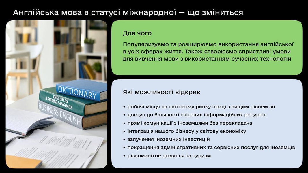 Законопроект, представленный в Верховную Раду президентом Владимиром Зеленским, направлен на установление английского языка в качестве международного языка общения в Украине и стимулирование его изучения среди граждан. Предполагается, что английский язык станет обязательным в образовательной системе на всех уровнях, начиная с детских садов и до университетов.