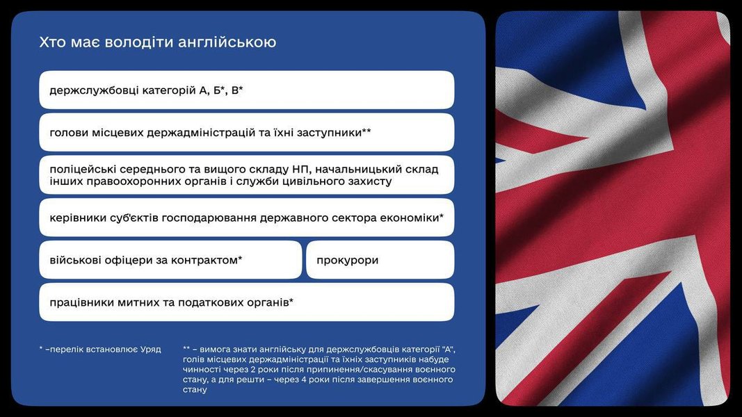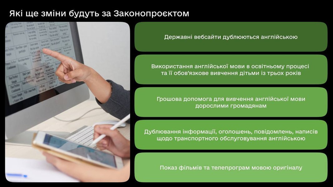 Министр цифровой трансформации Михаил Федоров дополнил, что каждый украинец получит возможность бесплатно повысить свой уровень владения английским языком. Государство будет финансировать специальные курсы и привлекать англоязычных волонтеров для работы в школах и проведения разговорных клубов. Кроме того, запланирован запуск отдельного портала с бесплатными уроками и курсами. Целью является обеспечение того, чтобы каждый украинец мог свободно общаться на английском языке.