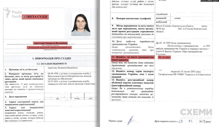 Журналисты программы "Схемы" предполагают, что у судьи Донецкого окружного административного суда Людмилы Арестовой есть российское гражданство. Об этом сообщает "Радио Свобода".
