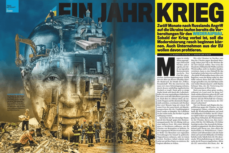 К годовщине с момента полномасштабного вторжения россии в Украину ведущий деловой журнал Австрии "Тренд" подготовил развернутый редакционный материал о послевоенном восстановлении Украины, в котором собрал мнения известных европейских политиков, бизнесменов и экспертов, передает "24 канал".