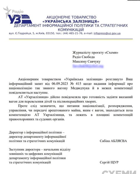 АО "Українська залізниця" не смогла национализировать "золотой вагон"- ресторан бывшего лидера запрещенной в Украине партии ОПЗЖ Виктора Медведчука, поскольку это в компетенции судебных и правоохранительных органов. Об этом говорится в ответе на запрос журналистов "Схем" (Радио Свобода).
