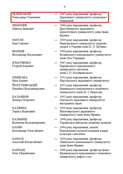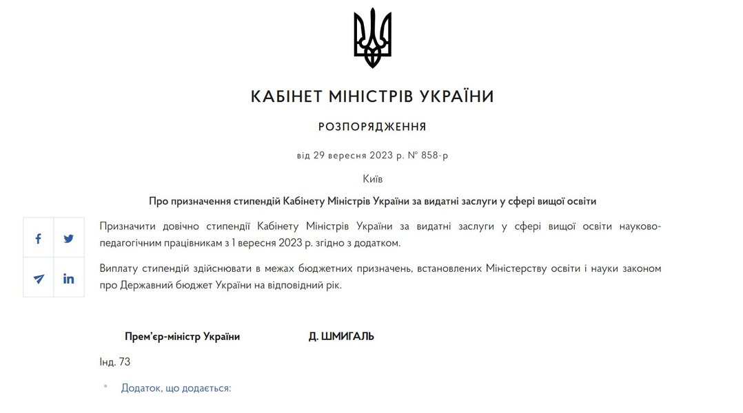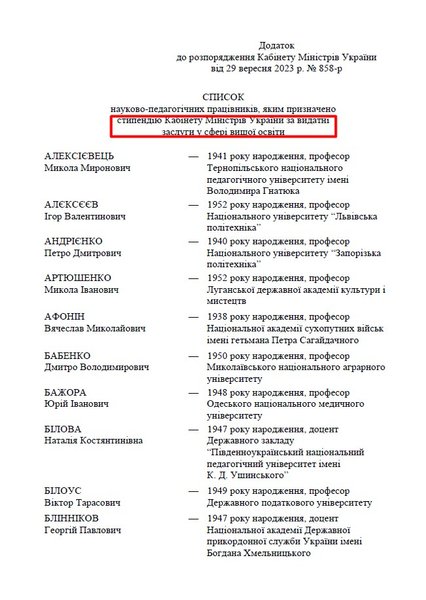 На портале Кабмина опубликовали текст Распоряжения №858-р от 29 сентября 2023 года. В документе говорится о назначении пожизненной стипендии педагогам. В перечне — 118 человек. На третьей странице указано имя Александра Семеновича Зеленского.