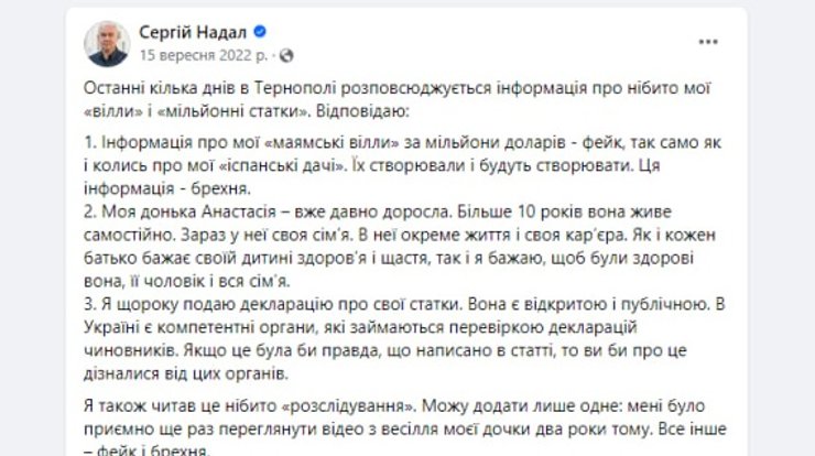 На обнародование новых данных городской голова Тернополя Сергей Надал пока не отреагировал, а в прошлом году он опубликовал пост по поводу своих маямских имений. Он назвал это "фейком и ложью".