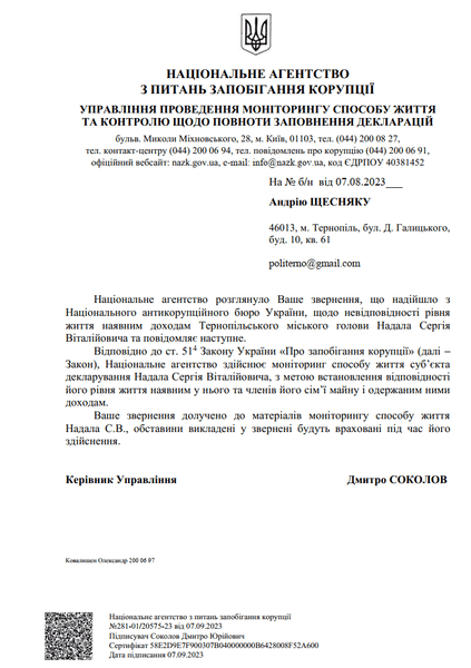 По поводу "маямской недвижимости" тернопольского мэра Офис генпрокурора Украины открыл дело по статье УКУ "Незаконное обогащение". Досудебное расследование осуществляет НАБУ. В то же время НАПК начало проверку относительно "установления соответствия уровня жизни имеющимся у Сергея Надала и членов его семьи имуществу и полученным доходам". Также НАПК обратилось в Государственную службу финансового мониторинга Украины для дальнейшей проверки финансовым мониторингом США счетов Анастасии Родригес и направило запрос в ФБР с этой же целью. Отдельно сделали запросы в пограничную и таможенную службы США относительно пересечений границы городским головой Тернополя.