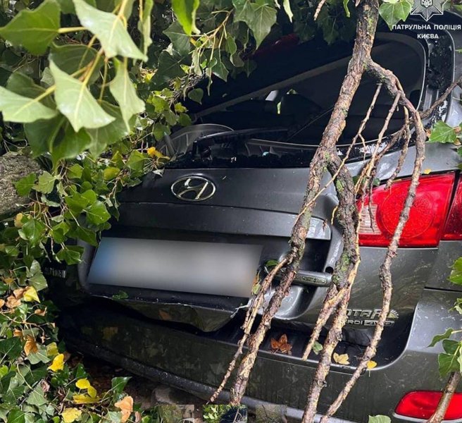 На проспекте Берестейском на транспортное средство упало дерево. Человек, который находился в машине, от госпитализации отказался.