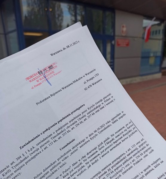 "Сообщение об оскорблениях поляков и подстрекательстве к преступлению господином Кириллом Тимошенко из русскоязычной группы "Пошлая Молли" — подано", — написал Кравец.