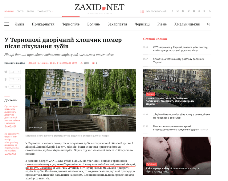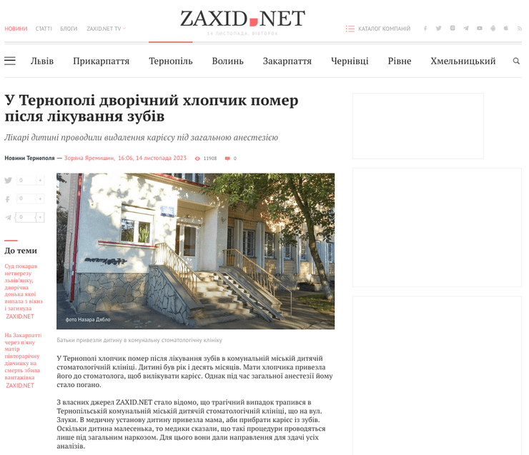 Однако, спустя время в статью были внесены изменения. Журналисты написали, что трагедия случилась в стоматологическом отделении Тернопольской коммунальной областной детской больнице, расположенной по улице Сахарова.