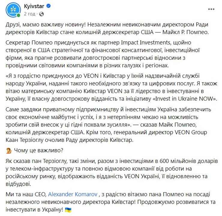 Бывший американский чиновник получил должность независимого неисполнительного директора. Майк Помпео, как говорится в сообщении "Киевстар", с нетерпением ждет возможности сделать свой вклад.