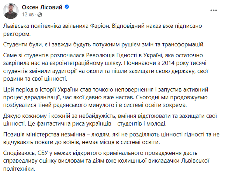 Также увольнение экс-депутата из НУ "Львовская политехника" подтвердил и Министр образования и науки Оксен Лисовой. Он опубликовал на своей странице в Facebook сообщение, в котором отметил, что соответствующий приказ об увольнении Ирины Фарион уже подписан ректором.