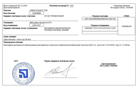 Григорий Козловский и Emily Resort передали на помощь ВСУ 2 миллиона гривен (квитанции)